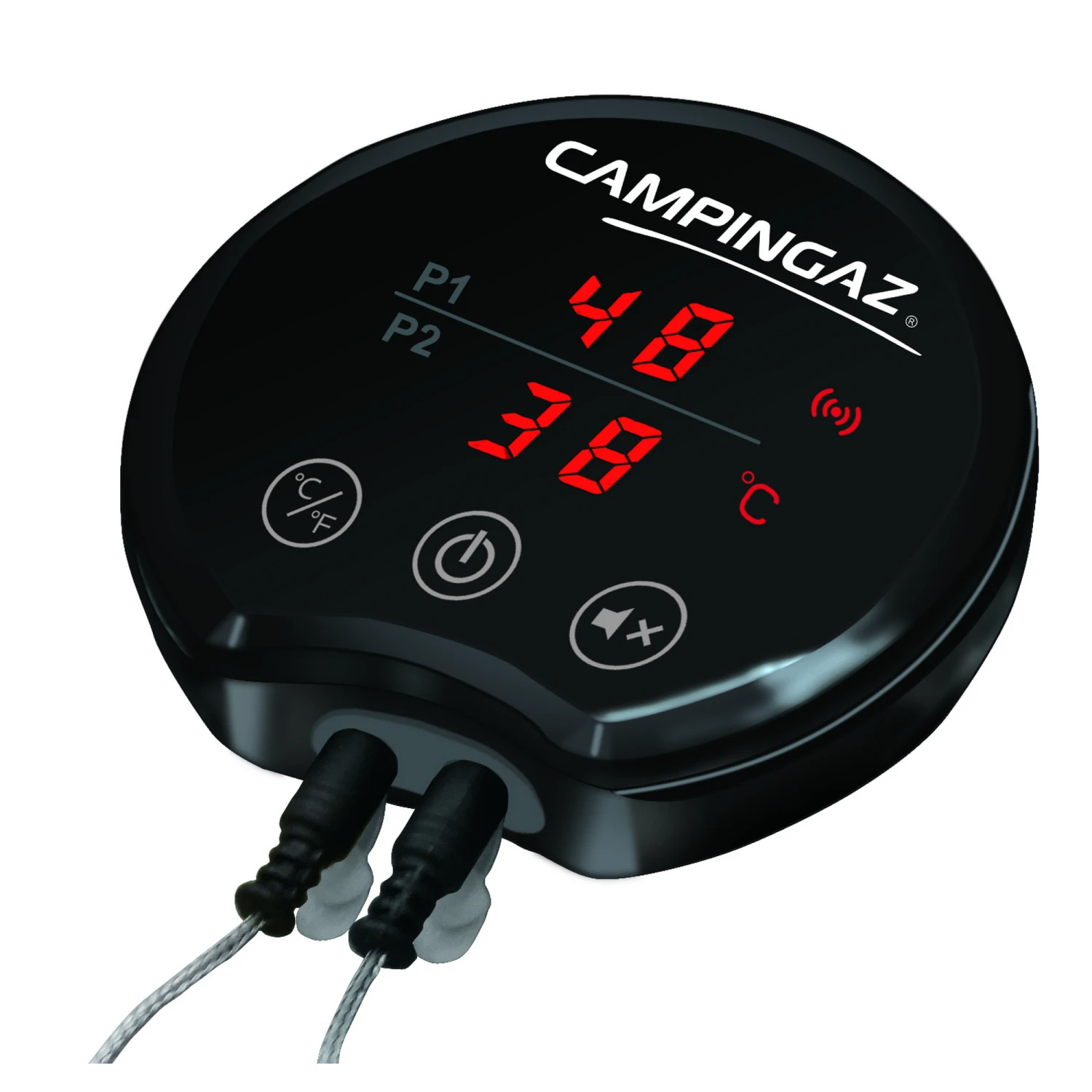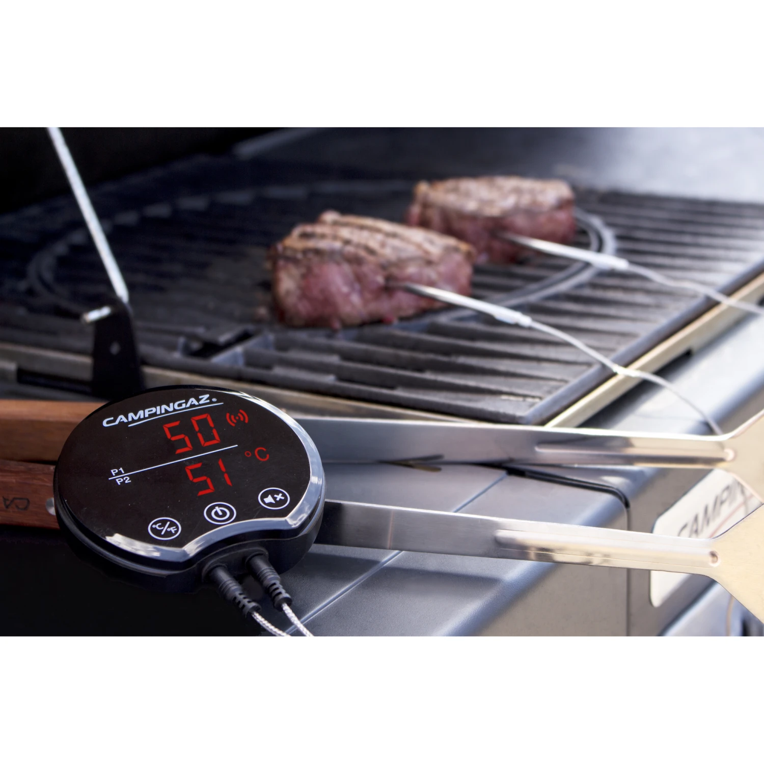 Für perfekte Grillergebnisse lohnt sich die Messung der Kerntemperatur des Grillguts. Mit dem Campingaz Bluetooth-Grillthermometer ‚Premium Connected‘ gelingt dies besonders leicht. Das BBQ-Thermometer ist mit einem Touchscreen und zwei Temperaturfühlern ausgestattet. Es kann per kostenloser App auf Android- oder iOS-Geräten gesteuert werden, dient aber auch als reines Thermometer. Das Gerät enthält bereits 8 vorprorammierte Gerichte, außerdem lassen sich zusätzliche Gerichte selbst einspeichern.