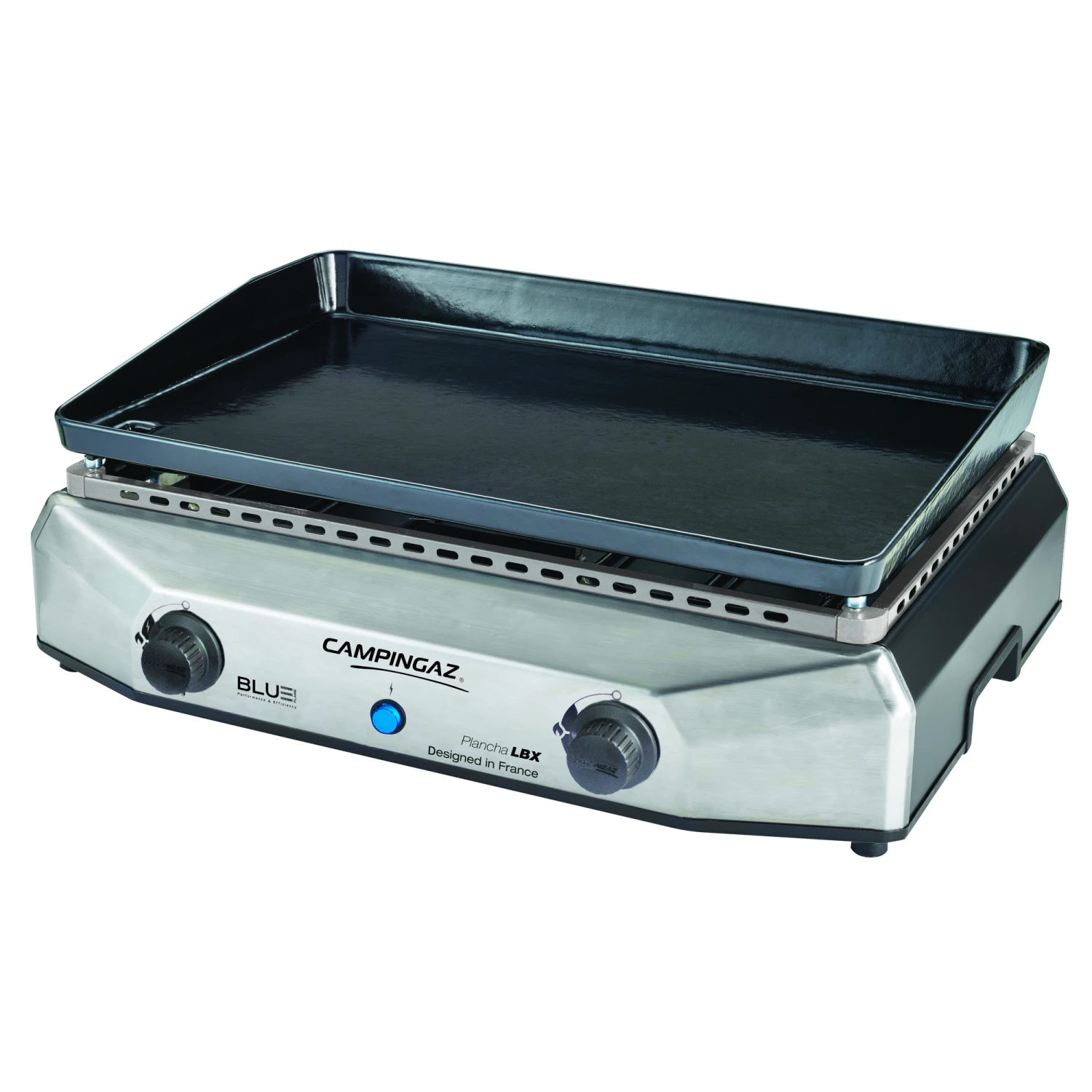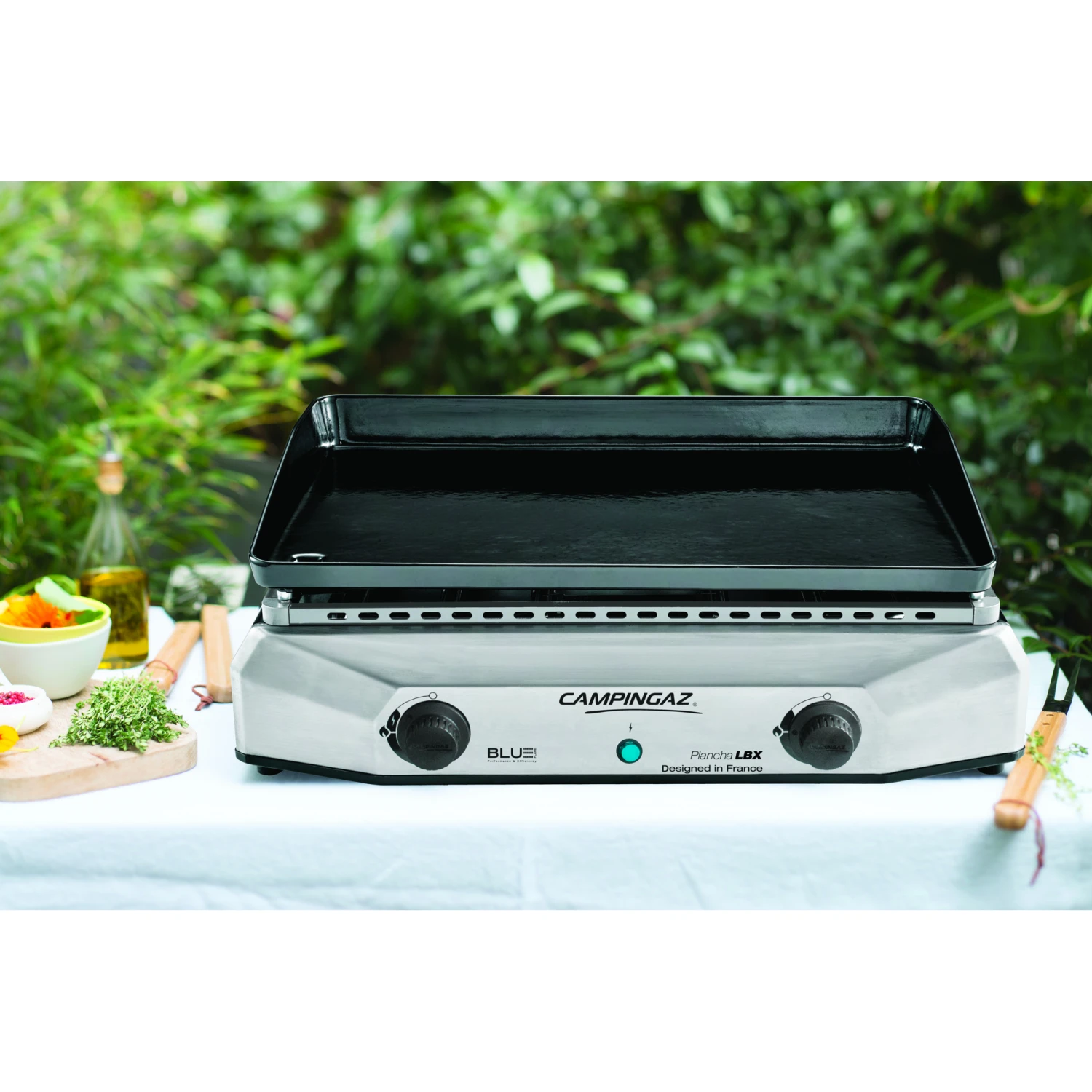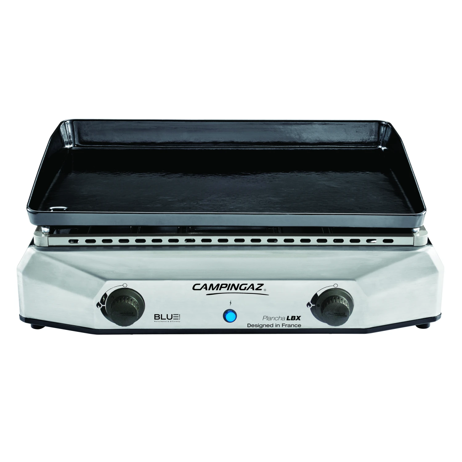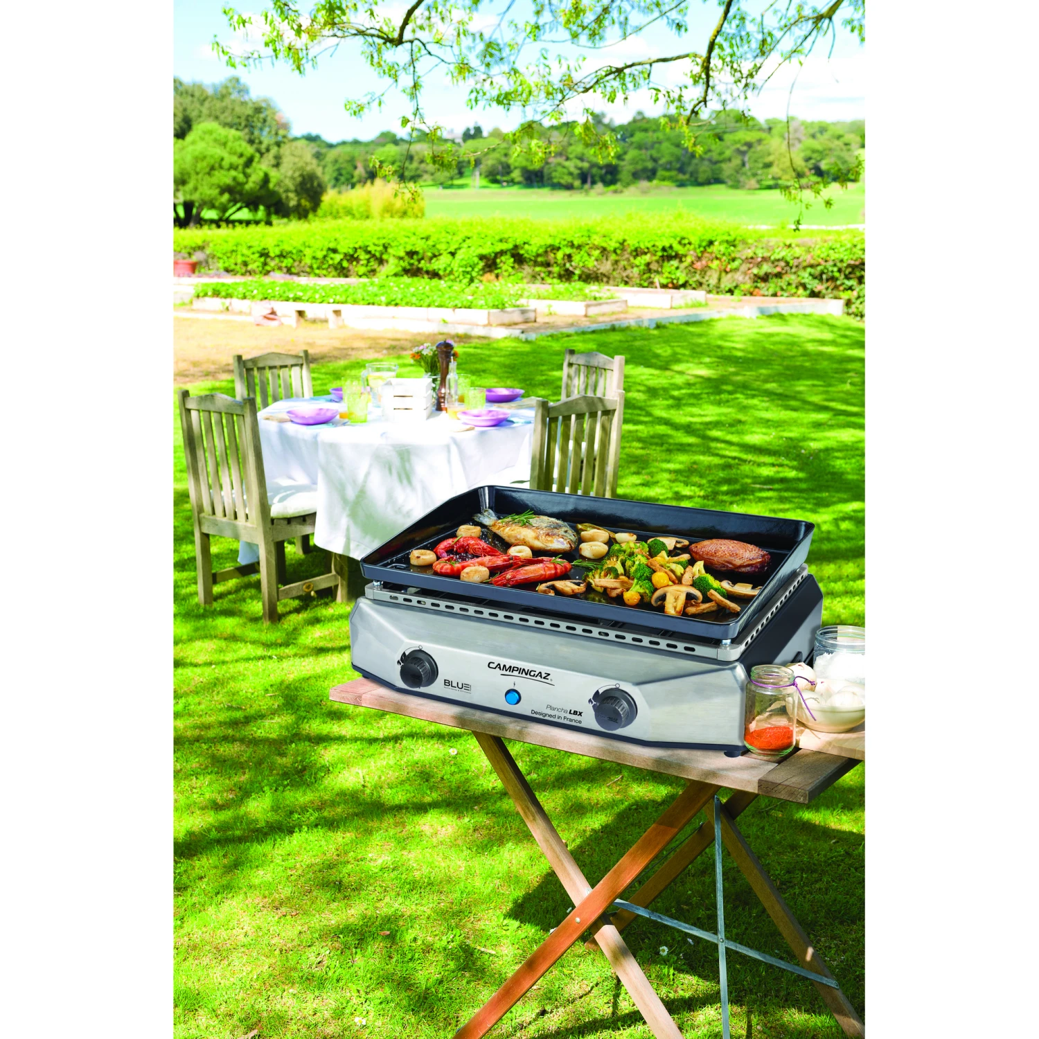 Mediterraner Grillgenuss: Der Campingaz Gas-Kontaktgrill ‚Plancha‘ eignet sich bestens für die schonenden Zubereitung von Gemüse, Fisch und Fleisch auf der extra heißen Grillplatte aus emailliertem Gusseisen. Die Platte ist 60 x 40 groß besitzt zwei stufenlos regulierbare Gasrenner mit Blue Flame Technologie mit insgesamt 6 kW für eine optimale Hitzeverteilung und -justierung. Da die Grillplatte neigbar ist, kann überschüssiges Fett leicht ablaufen und bleibt es dir selbst überlassen, ob du Öl oder Fonds zum Grillen und Garen verwendest. So ergeben sich vielfältige Zubereitungsmöglichkeiten. Der kompakte Grill verfügt über höhenverstellbare Füße, sodass sich das Tischgerät an unterschiedliche Untergrüne anpassen lässt. Dank der integrierten Griffe kannst du den Grill bequem an seinen Einsatzort transportieren.