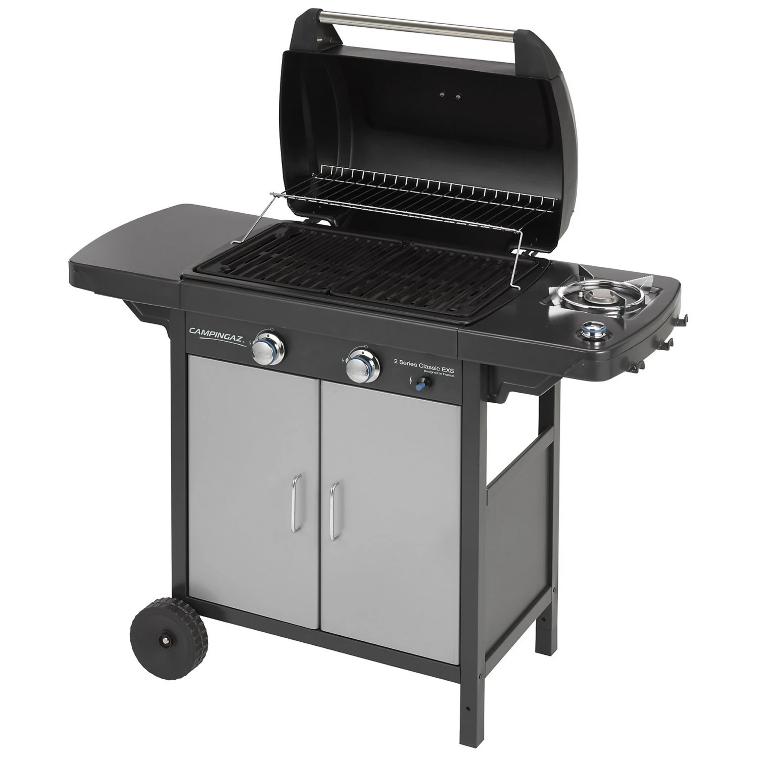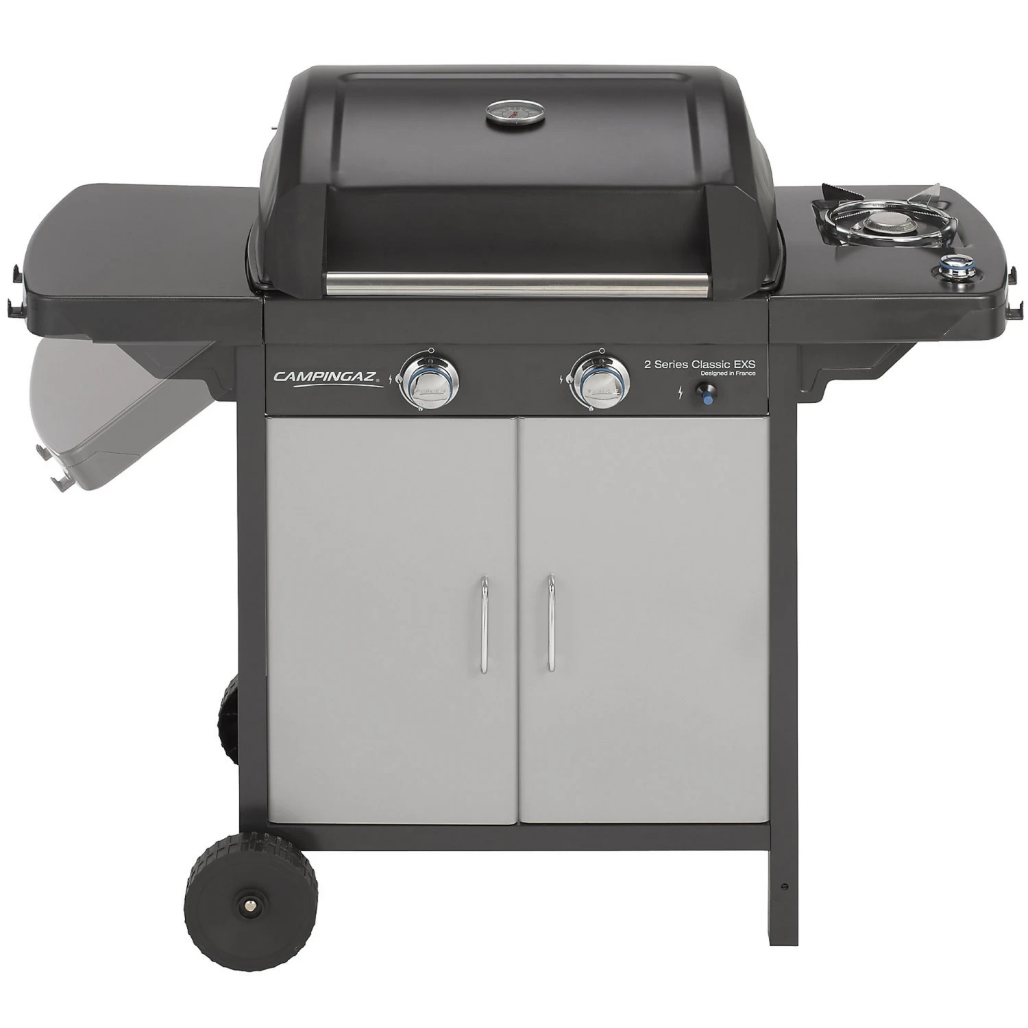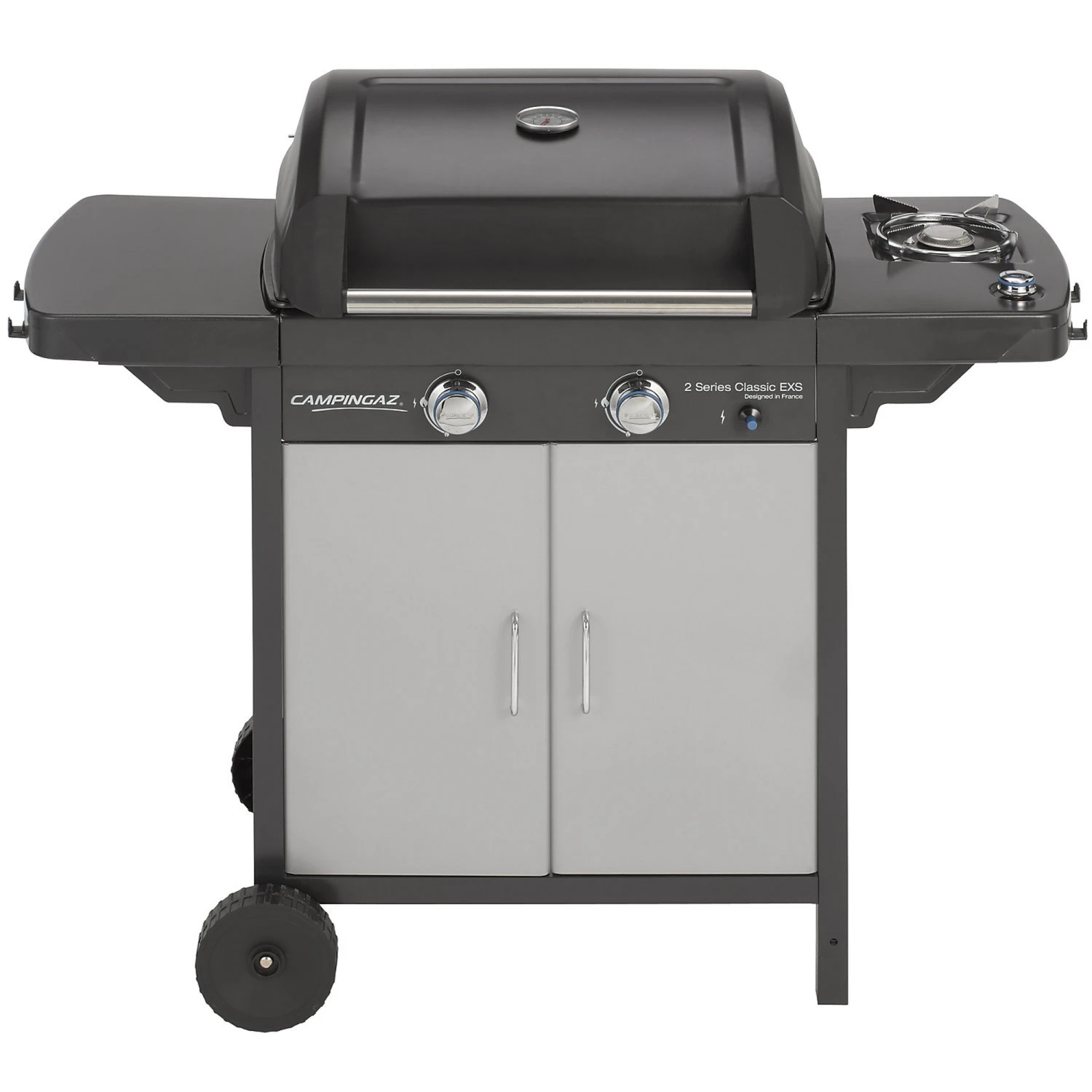 Gutes muss nicht immer groß und teuer sein: Der Campingaz Gasgrill ‚2 Series Classic‘ hat ein kompaktes Design mit einer abklappbare Seitenablagen für die platzsparende Lagerung. Perfekt für jeden, der ein Auge aufs Budget hat und besonders geeignet zum Grillen mit kleineren Gruppen: Die beiden leistungsstarken Hauptbrenner aus aluminisiertem Stahl werden per Piezo-Zündung gestartet. Sie bieten mit insgesamt 7,5 kW effektive Hitze und der emaillierte Grillrost aus Gusseisen sorgt für perfekt zubereitetes Grillgut. Zusätzlich dient ein Seitenbrenner mit 2,1 kW zur Zubereitung von Beilagen und Saucen. Neben der direkten Grillmethode über der Flamme kannst du Gemüse, Fisch und Fleisch bei geschlossenem Deckel auch indirekt auf der 0,21 m² großen Grillfläche garen und auf einem kleineren Warmhalterost für den späteren Verzehr auf Temperatur halten. Der robuste Stahlwagen ist mit zwei großen Rädern ausgestattet, sodass sich der Gasgrill leicht an seinen Einsatzort transportieren lässt. Der Unterschrank hat zwei Türen und bietet zusätzlichen Stauraum.