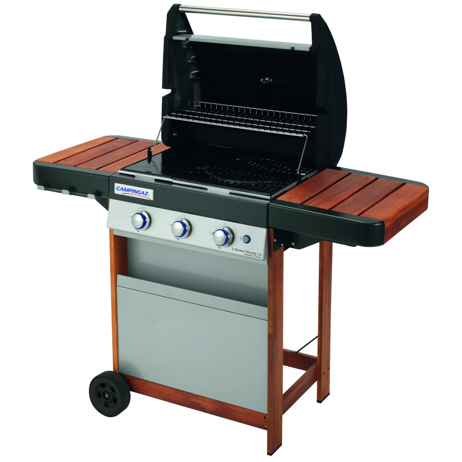 Der Gasgrill ‚3 Series Woody LX‘ passt mit seinem kombinierten Design aus Stahl und naturverbundenem Akazienholz gut in deinen Garten. Er hat drei 9,6 kW leistungsstarke Edelstahlbrenner und eine großzügige Grillfläche von 2.800 cm². Dank des im Grillrost enthaltenen Culinary Modular Basiseinsatzes und den passenden Kocheinsätzen, wie beispielweise dem Pizzastein oder der Paellapfanne, wird dir die nötige Abwechslung beim Grillvergnügen geboten. Das InstaClean™ System erleichtert dir nach dem Grillen die Reinigung, da die Grillfläche und die Grillwanne einfach in der Spülmaschine, oder unter fließendem Wasser, gereinigt werden können. Durch die zwei abklappbaren Seitenablagen, sowie den 2 Rädern, kann der ‚3 Series Woody LX‘ mühelos bewegt werden. Der Grill bietet zudem eine hohe Stabilität mit einem Gewicht von 45 kg. Nur im Freien verwenden. Die in Deutschland und Österreich betriebenen Geräte müssen mit dem im Lieferumfang enthaltenen 50 mBar Regler für Propan und dem dazugehörigen Schlauch betrieben werden. Diese Geräte sind für 5 bis 15 kg Gasflaschen geeignet.