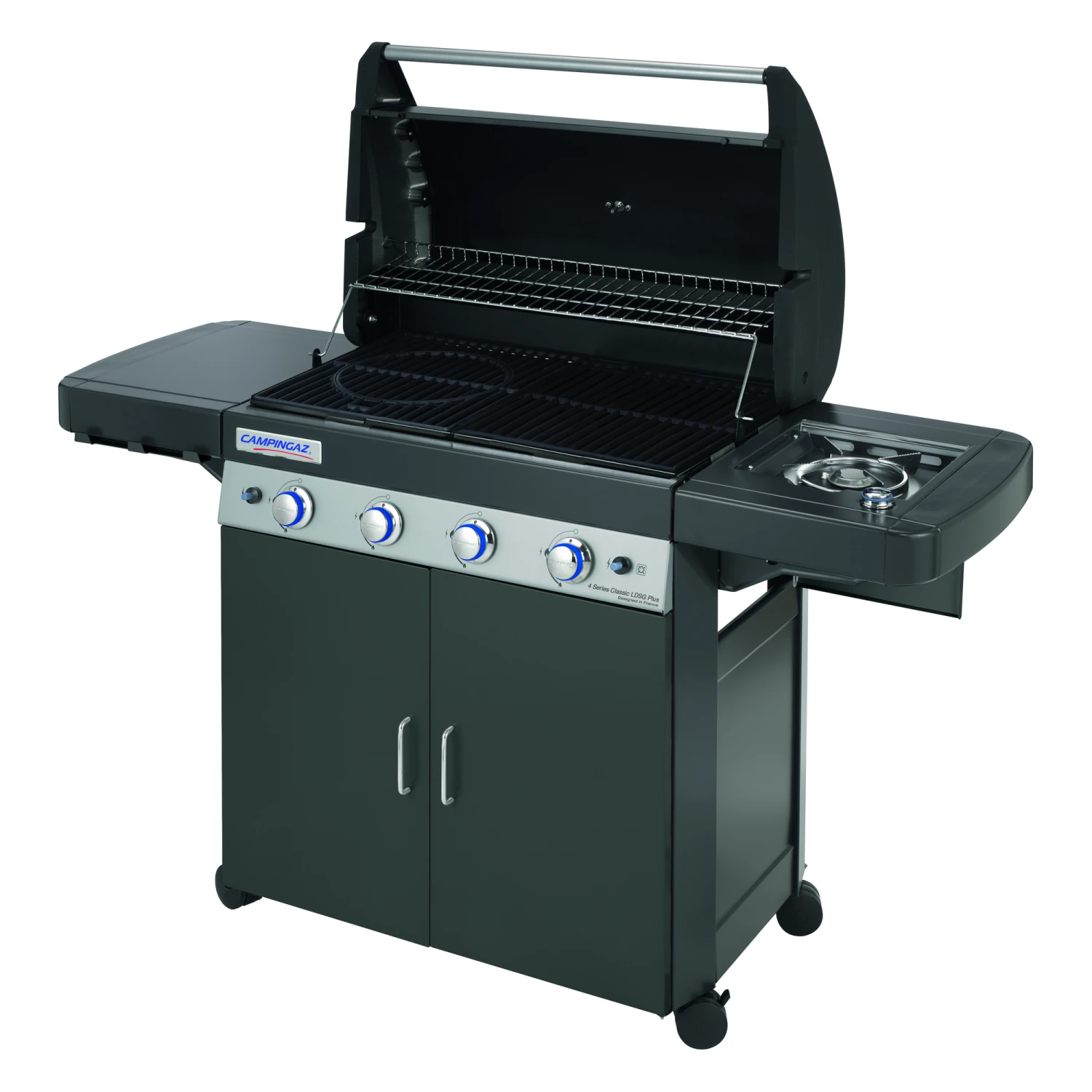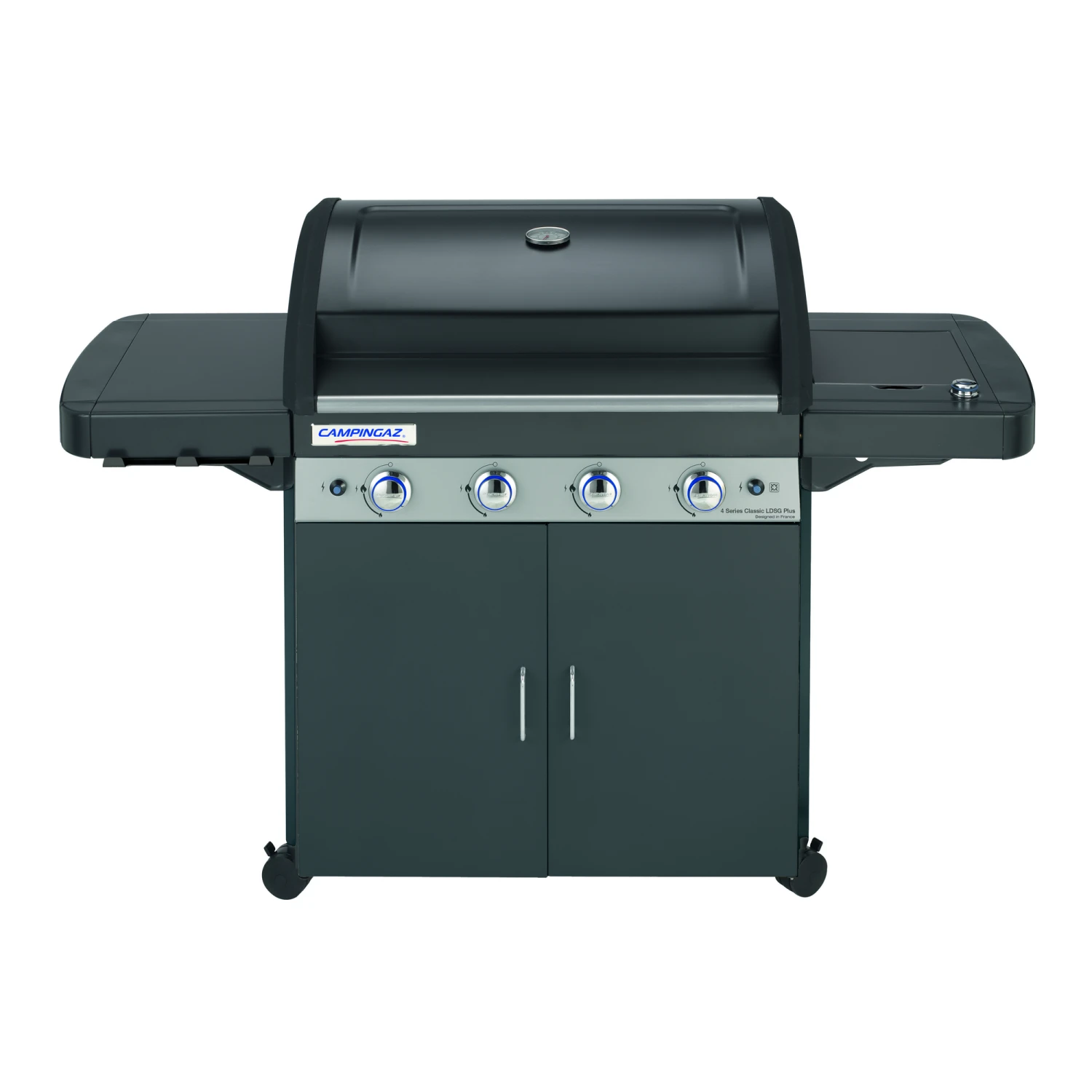 Ausgestattet mit 4 robusten Edelstahl-Rohrbrennern, wird der Campingaz Gasgrill ‚4 Series Classic‘ schnell zum Star auf deiner Grillparty. Mit seiner großen emaillierten Grillfläche von 61 x 46 cm macht er bis zu 16 Personen satt. Das Beste: Die vier Rohrbrenner mit insgesamt 12,8 kW werden mit Piezo-Zündung gestartet und lassen sich sehr fein und unabhängig voneinander regeln, sodass auch Grillgut mit unterschiedlichen Garzeiten und -Temperaturen gleichzeitig und auf den Punkt zubereitet werden kann. Zusätzlich dient ein Seitenbrenner mit 2,3 kW zur Zubereitung von Beilagen und Saucen. Auf dem Warmhalterost kannst du fertiges Grillgut ruhen lassen oder für die zweite Runde und Partynachzügler aufbewahren. Das kompakte Design und der abklappbare Seitentisch sorgen für eine platzsparende Lagerung. Neben der direkten Grillmethode über der Flamme kannst du Gemüse, Fisch und Fleisch bei geschlossenem Deckel auch indirekt garen. Nach dem Grillvergnügen ist im Nu alles wieder sauber, denn dank der InstaClean-Technologie lässt sich der Grillrost bequem in der Spülmaschine reinigen. Der robuste Stahlwagen ist mit vier Rädern ausgestattet, sodass sich der Gasgrill leicht an seinen Einsatzort transportieren lässt. Für einen sicheren Stand sorgen zwei Bremsen an den Rädern auf der Grillvorderseite. Der Unterschrank hat zwei Türen und bietet zusätzlichen Stauraum. Da die Reglerknöpfe sind beleuchtet sind, siehst du ihre Position auch im Dunkeln.
