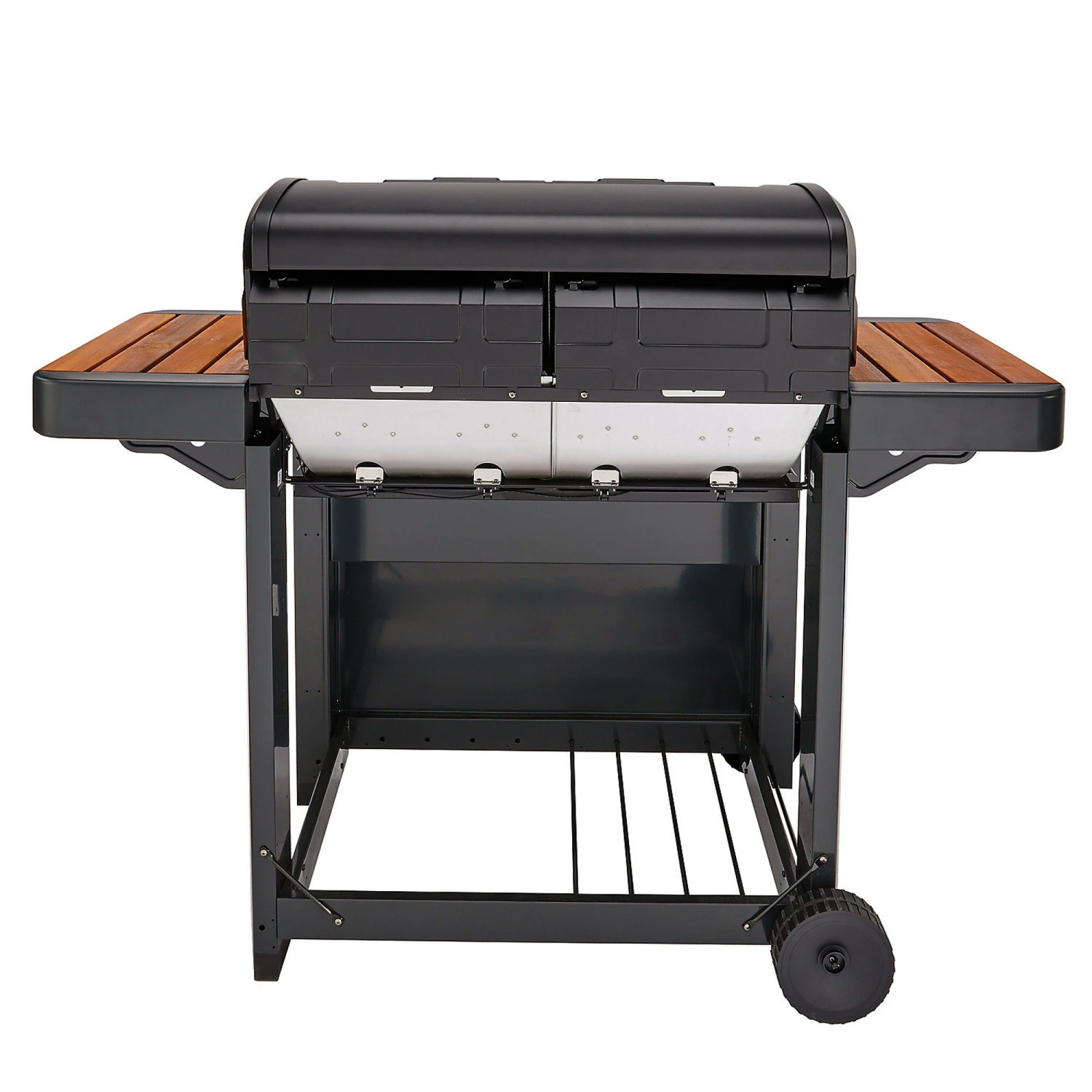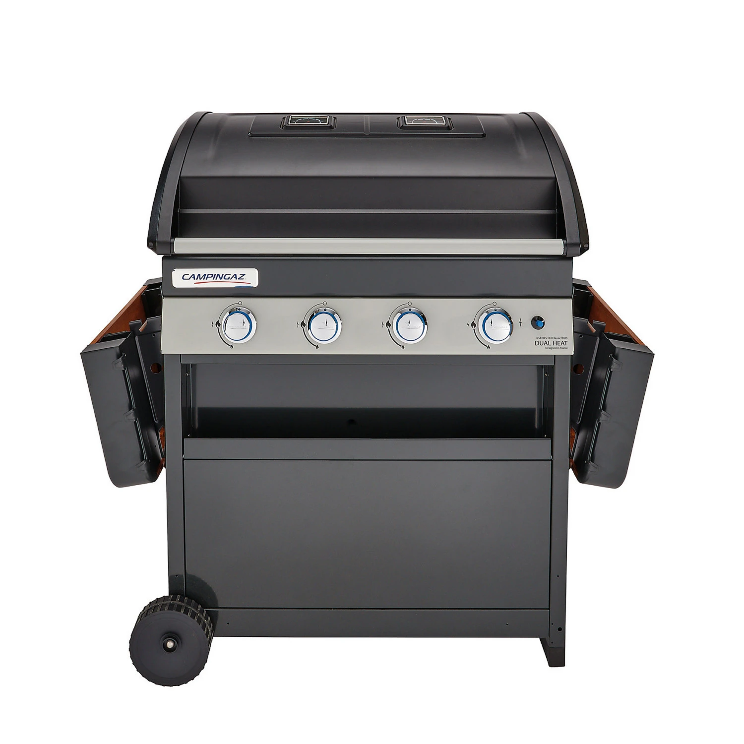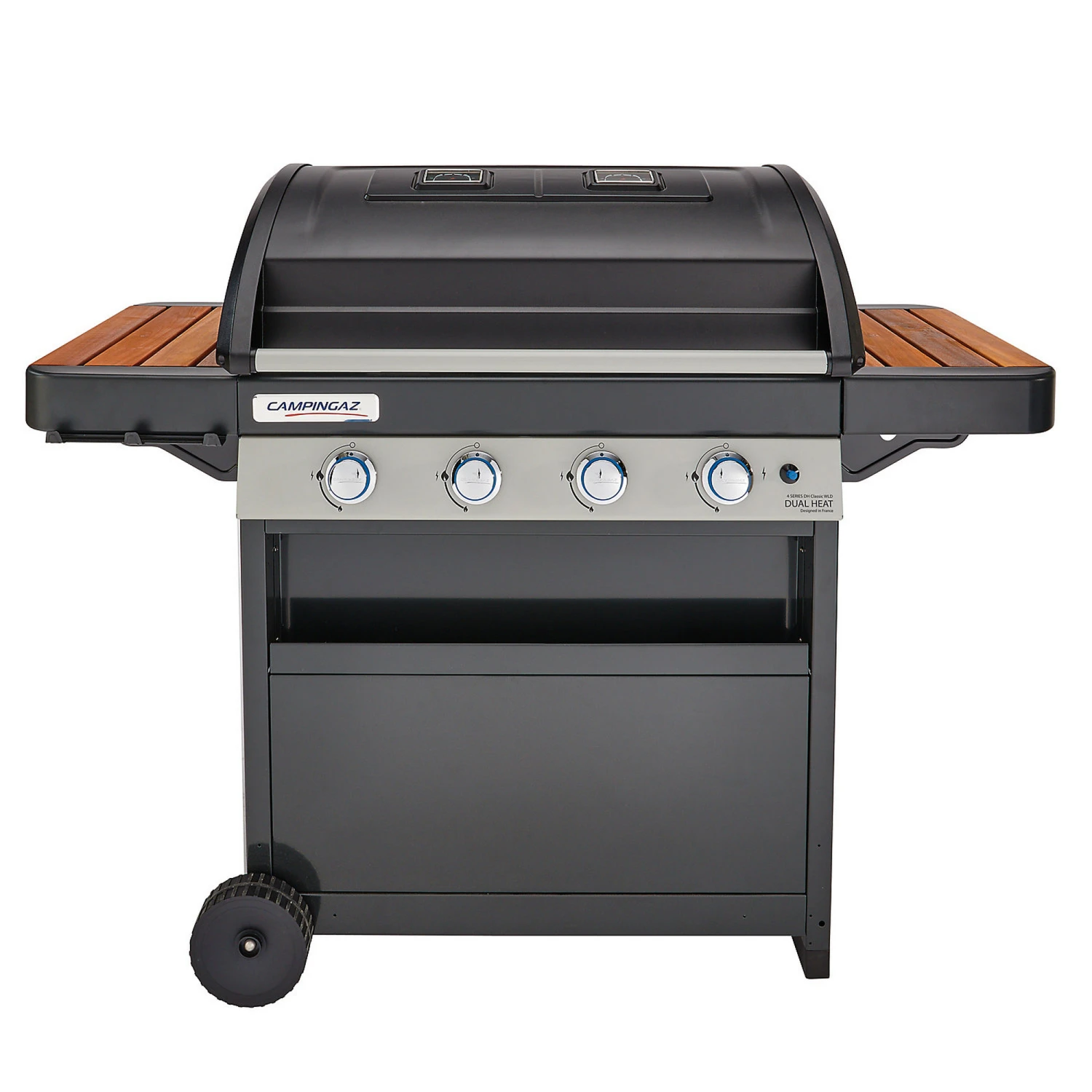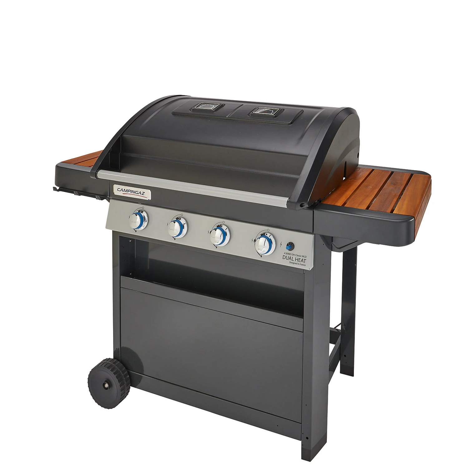 Bis jetzt war es nicht immer einfach, Fleischesser und Vegetarier oder Veganer auf einer Grillparty gleichermaßen zufrieden zu stellen. Mit dem Campingaz Gasgrill ‚4 Series Dual Heat BBQ‘ kannst du Fleisch und vegetarisches Grillgut klar voneinander trennen, denn sowohl Deckel als auch Grillwanne besitzen eine herausnehmbare und spülmaschinengeeignete Trennwand. Dadurch lassen sich beide Seiten des Grills unabhängig voneinander betreiben. Beide Grillzonen sind mit einem separaten Thermometer im Deckel ausgestattet, damit du jede Temperaturzone immer im Auge behalten kannst. So stellst du sicher, dass auch Hauptspeise und Beilagen oder Speisen mit unterschiedlichen Garzeiten gleichzeitig auf den Punkt gegart werden können. Mit einer Grillfläche von 78 x 45 cm und zwei Warmhalterosten mit je 15 x 35 cm hast du genug Platz, um bis zu 16 Personen satt zu bekommen. Für kulinarische Abwechslung beim Grillen sorgt der Culinary-Modular-Basis-Einsatz, der zum Beispiel den Einsatz eines Grillwoks ermöglicht. Nach dem Grillvergnügen ist der Grill im Nu wieder sauber: die emaillierten Grillroste aus Gusseisen sind mit InstaClean-Technologie ausgestattet und lassen sich bequem in der Spülmaschine reinigen. Die vier Edelstahl-Rohrbrenner haben einen Gesamtleistung von 12,8 kW und werden sicher per Piezo-Zündung gestartet. Damit sich der 2-in-1-Grill leicht an seinen Einsatzort transportieren lässt, ist der Stahlwagen mit zwei großen Rädern ausgestattet. Neben zwei abklappbaren Seitentischen aus Holz bietet der Regaleinsatz in der Stahlfront zusätzlichen Stauraum für Geschirr und anderes Grillzubehör.