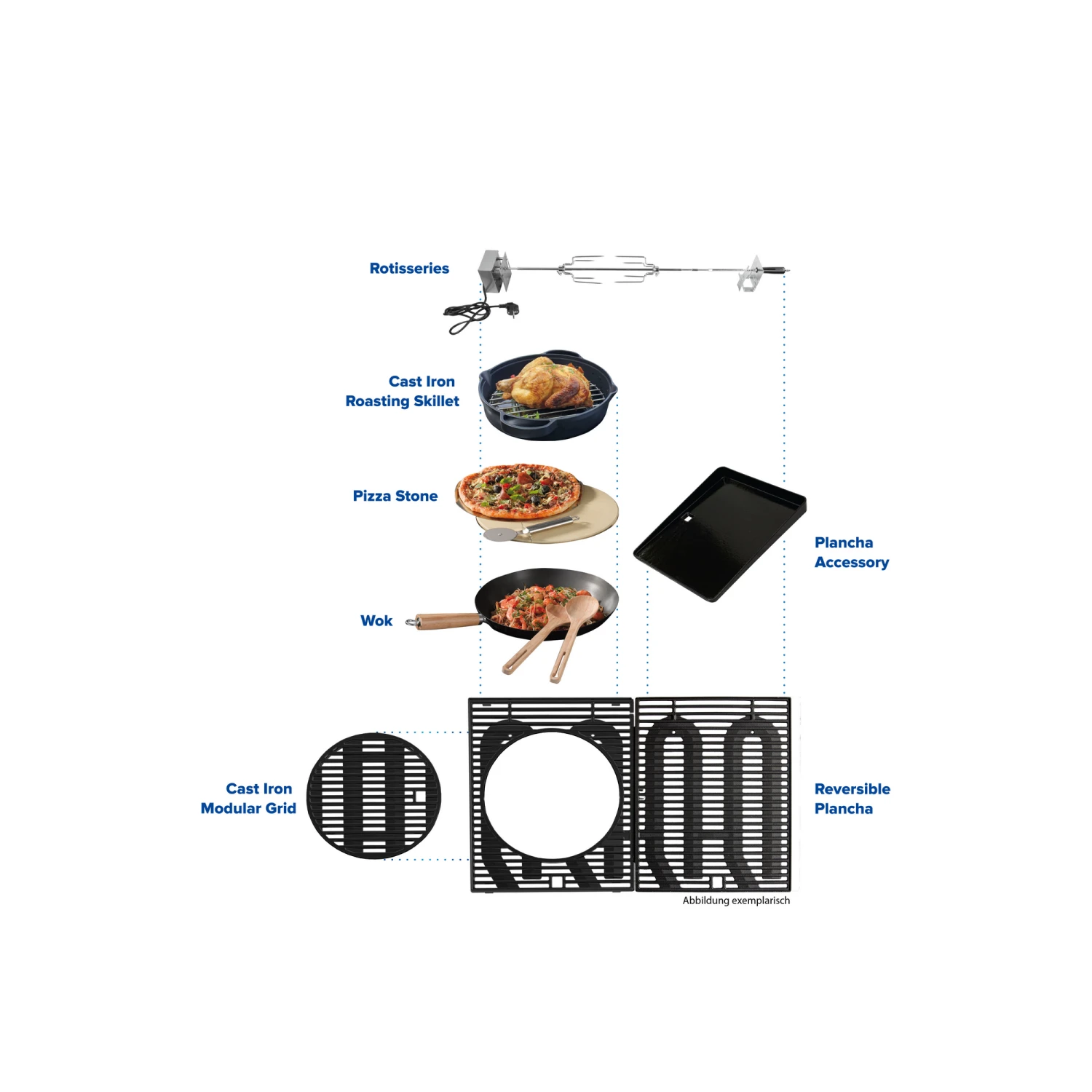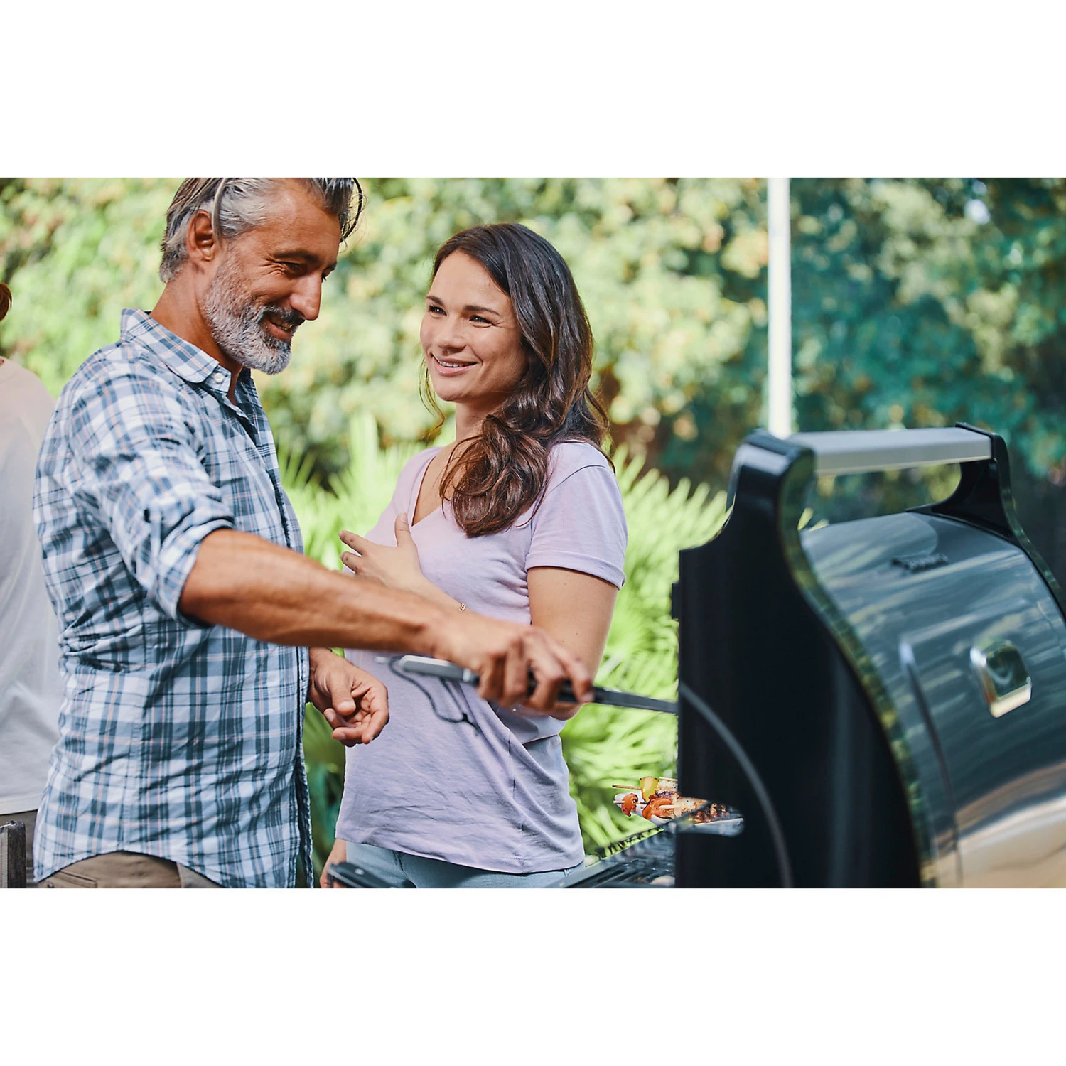 Der Gasgrill ‚4 Series Select 37485‘ garantiert mit den 4 patentierten Blue Flame Power Brennern aus Edelstahl eine gleichmäßige und kraftvolle Hitze. Während dem Grillen kommt es, dank dem Design der Brenner und dem integrierten Brennerschutz, in den Grillrosten zu deutlich weniger Aufflammen für ein gelungenes Grillerlebnis. Zudem ist der Grill mit seinem elegantem, grauen Stahlwagen ein echter Hingucker in deinem Garten. Der Grillrost ist aus Gusseisen und beinhaltet die Culinary Modular Basis. Hier können nach Belieben weitere Kocheinsätze erworben werden – für noch mehr Kreativität und Abwechslung. Hierzu entnimmst du einfach den inneren Ring des Grillrostes und setzt Zubehörteile, wie einen Pizzastein oder einen Wok in die Basis. Dank des neuen InstaClean™ Aqua Systems Pro ist nach dem Grillvergnügen selbst die Reinigung spielend einfach. Für die Anwendung des Systems befüllst du die von vorne zugänglichen Fettauffangschalen mit Wasser. Das Wasser kann während des Grillvorgangs verdunsten, sodass das Einbrennen von Fett- und Lebensmittelrückständen in der Schale verhindert wird und du dir lästiges Schrubben nach dem Grillen ersparen kannst. Die Push2Fold Seitentische stellen ein robustes und langlebiges Beistelltischsystem mit verbessertem Klappmechanismus für eine platzsparende Aufbewahrung dar. Der Grill verfügt des Weiteren über eine elektronische Zündung, einen Deckel aus Stahl und Aluminium und zwei Räder für den einfachen Transport. Nur im Freien verwenden. Die in Deutschland und Österreich betriebenen Geräte müssen mit dem im Lieferumfang enthaltenen 50 mBar Regler für Propan und dem dazugehörigen Schlauch betrieben werden. Diese Geräte sind für 5 bis 15 kg Gasflaschen geeignet.