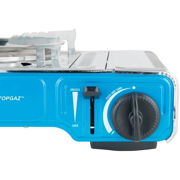 Der Einflammkocher Camp’Bistro DLX Stopgaz eignet sich hervorragend für Tagesausflüge, Picknicks, Camping und viele andere Gelegenheiten. Die Piezozündung und der stufenlos verstellbare Regler machen die Bedienung und die Regelung sehr komfortabel. Der Topfträger und das obere Hitzeblech sind aus Edelstahl, für eine einfache Reinigung und eine bessere Hitzeabstrahlung. Der beim 2022er Modell überarbeitete Topfträger ist in der Handhabung noch einfacher und komfortabler als der des Vorgängermodells. Durch die Belüftungsschlitze zwischen Kochfeld und Kartusche wird die Hitze abgeleitet. Dies stellt einen besseren Schutz als bei vergleichbaren Geräten ohne Schlitze dar. Außerdem verfügt der Camp’Bistro DLX Stopgaz über eine Kartuschensicherung, durch den Hebel neben dem Gasregler kann die Gaszuführung schnell unterbrochen bzw. wiederhergestellt werden.