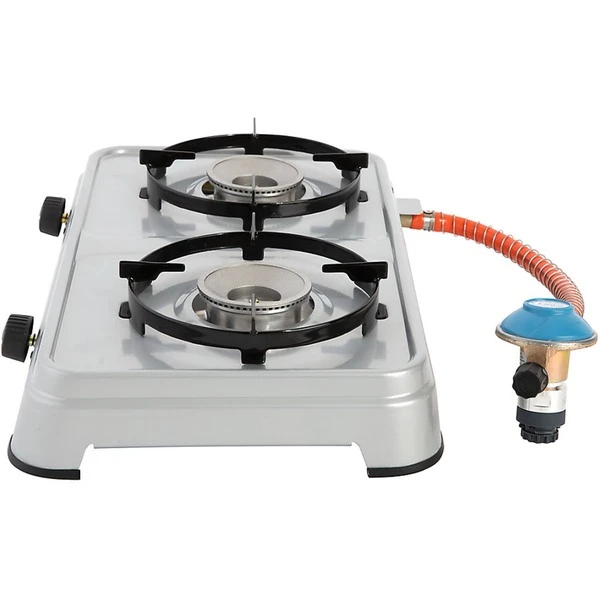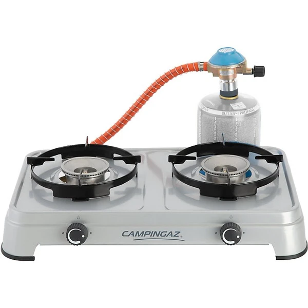 Leistung und ist leicht zu transportieren. Da der Schlauch und Regler schon fest montiert sind, muss man ihn nicht umständlich aufbauen. Man braucht nur die Easy-Click Plus Kartusche anschließen und schon kann es losgehen. Die beiden 1,8 kW starken Brenner lassen sich mit den „Drück & Dreh“ Knöpfen stufenlos und unabhängig voneinander regulieren, so dass niemand lange auf sein Essen warten muss. Die beiden herausnehmbaren Topfträger sind spülmaschinenfest.