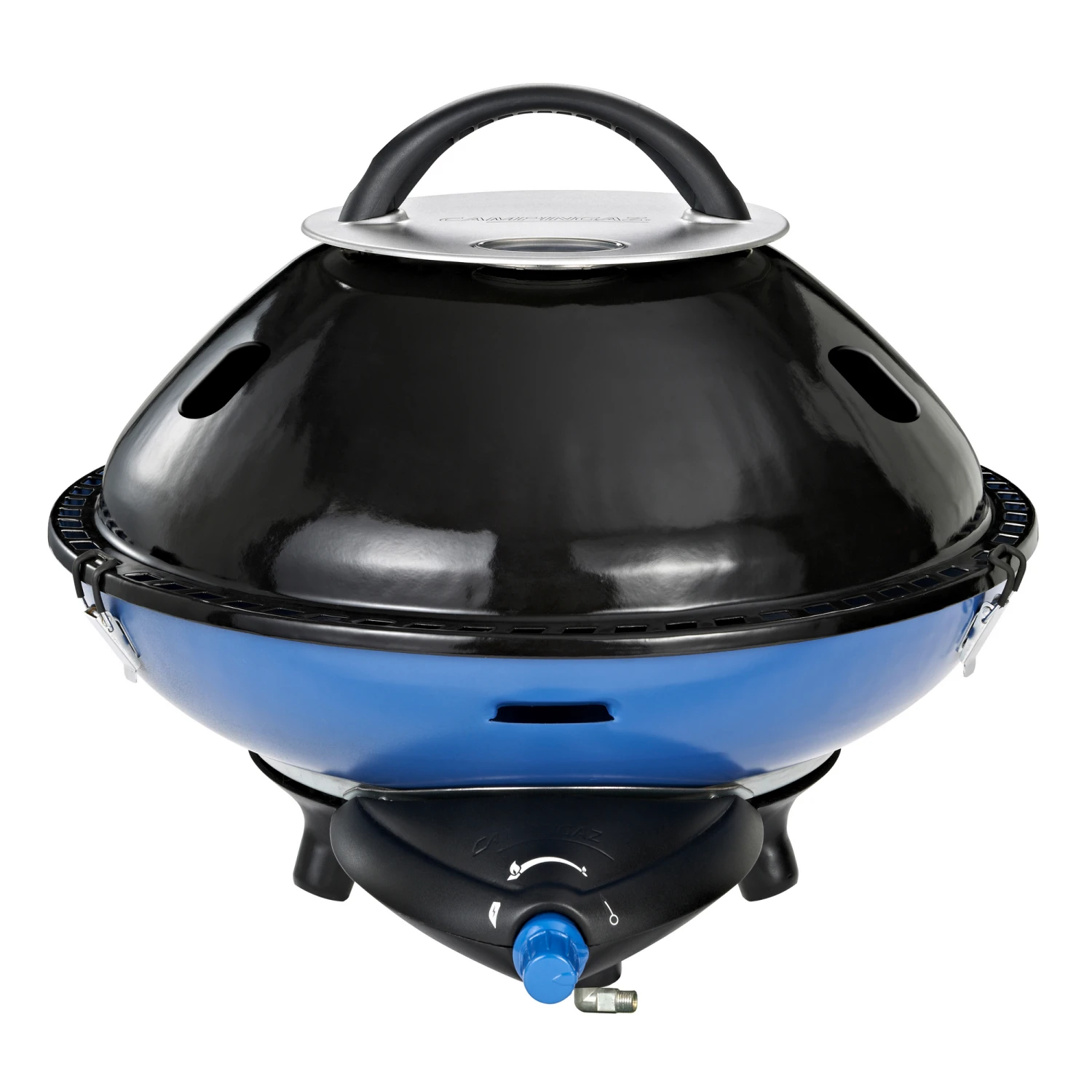 Leicht transportabler Party Grill 600 R mit Topfkreuz, wendbarer Grill- und Kontaktgrillplatte, Grillrost und Deckel. Die Ablagefläche unter dem Party Grill® kann für Utensilien genutzt werden und dient gleichzeitig als zusätzliche Stabilisierung. Die Grillfläche ist antihaftbeschichtet und die Hitzezufuhr ist über einen Drehknopf sehr fein regelbar. Fett und Fleischsaft tropfen in die Wasserschale, so werden Rauch und Stichflammen verringert. Praktische Standbeine können ganz einfach angebracht werden und werden zum Transport oder Lagerung im Grill verstaut.